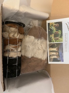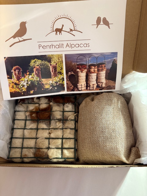 Round Hamper contains a round Bird feeder filled with alpaca fleece, a paper bag filled with at least 150g of fleece.